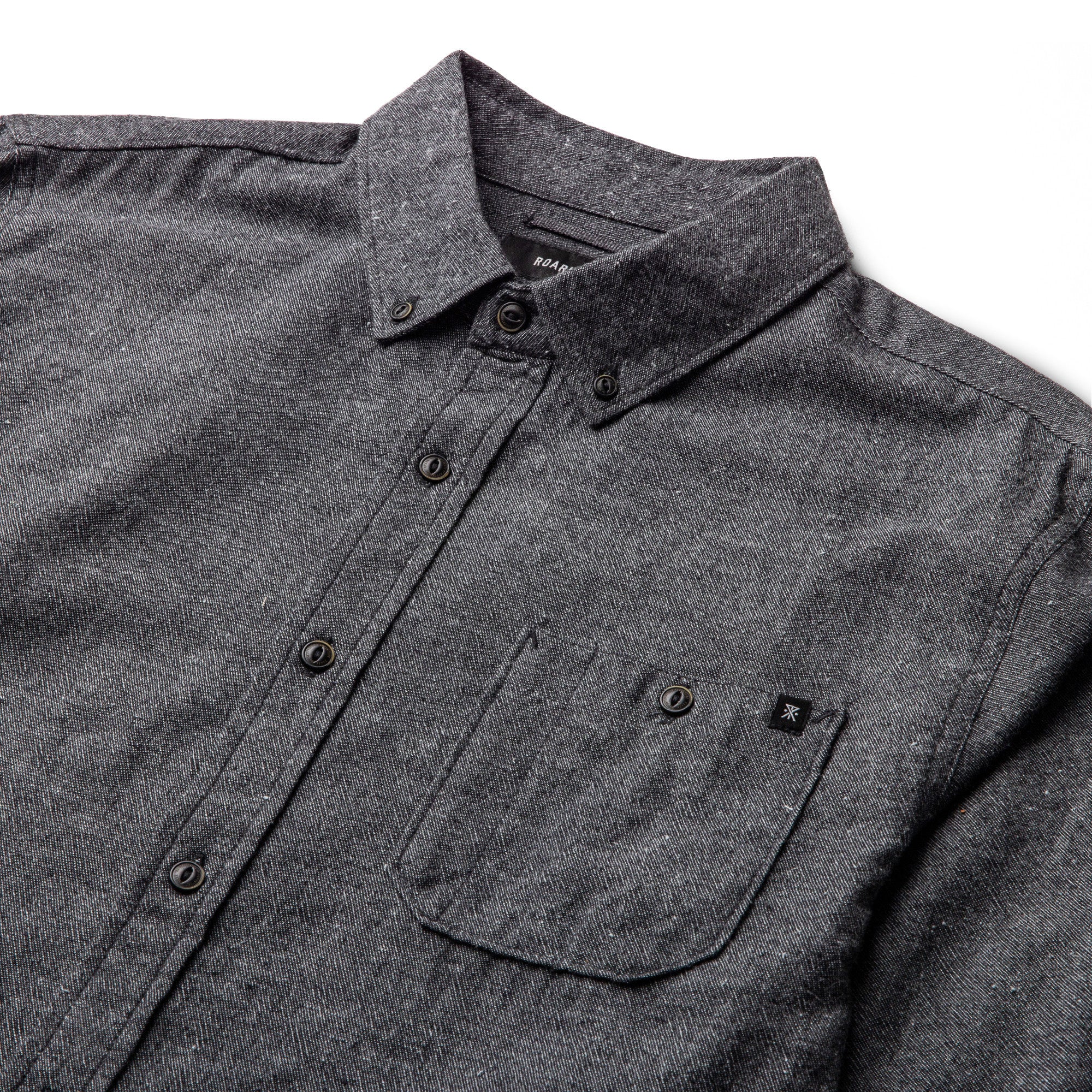 Finished in a washed mid-indigo with subtle flecking, it features a button-down collar, chest pocket, and a classic fit that layers easily or holds its own.